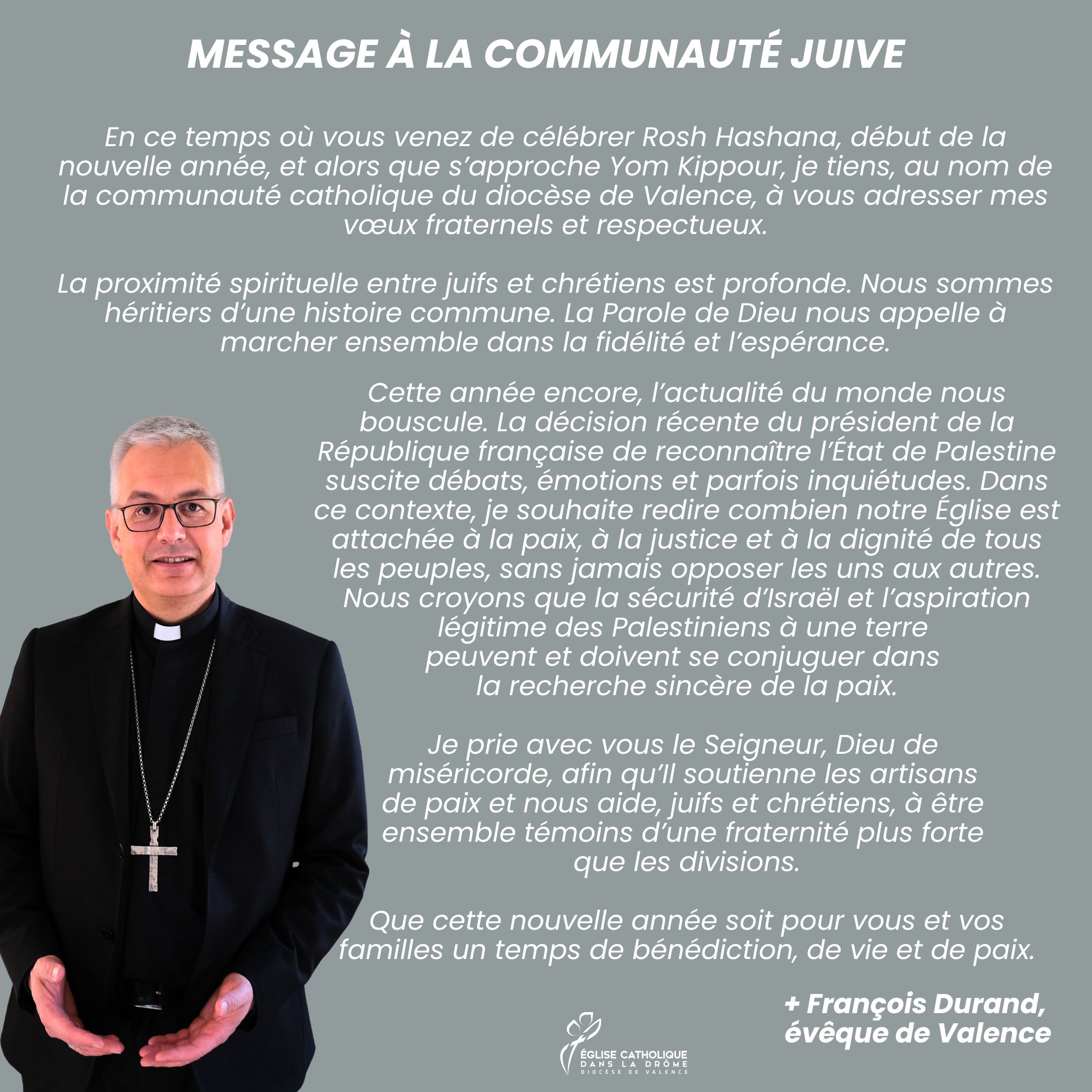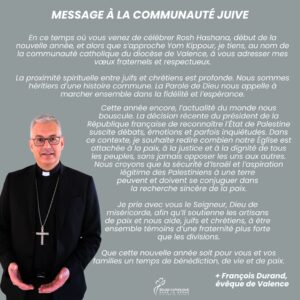 A l’occasion de la fête de Yom Kippour, jour saint du judaïsme, appelé le Jour du Grand Pardon, Monseigneur François Durand, évêque de Valence, adresse un message de fraternité et de paix à la communauté juive qu’il ira rencontrer pour la célébration de Yom Kippour jeudi soir.