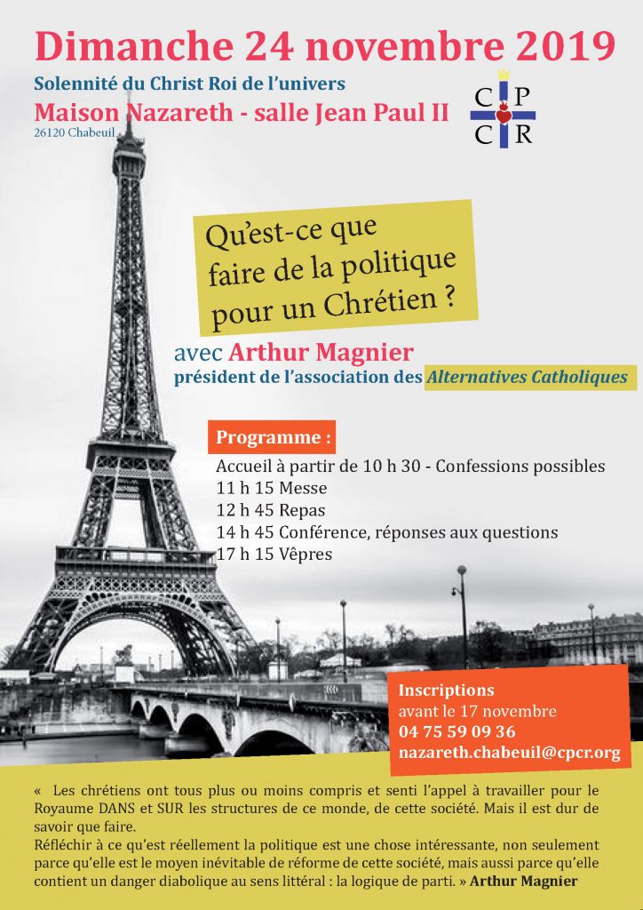Dimanche 24 novembre 2019, à l’occasion de la fête du Christ Roi de l’Univers, une conférence est organisée à la Maison Nazareth sur le thème : « Qu’est ce faire de la politique pour un chrétien ? » en présence d’Arthur Magnier, président de l’association des Alternatives Catholiques.
