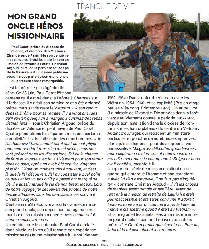 Le prêtre drômois Paul Carat a fêté ce mercredi 23 juin son centième anniversaire à la maison de retraite des missions étrangères à Lauris dans le Var. Il était entouré de sa famille mais aussi de Monseigneur Pierre-Yves Michel, évêque de Valence, de son petit neveu Christian Argoud, prêtre du diocèse de Valence, ou encore des Soeurs Amantes de la Croix installées actuellement à St Rambert d’Albon. Après quelques années de ministère dans la Drôme, Paul Carat est parti en mission au Vietnam pendant 25 ans où il a connu la guerre et la répression communiste. Retrouvez son portrait publié dernièrement dans notre magazine bimestriel.