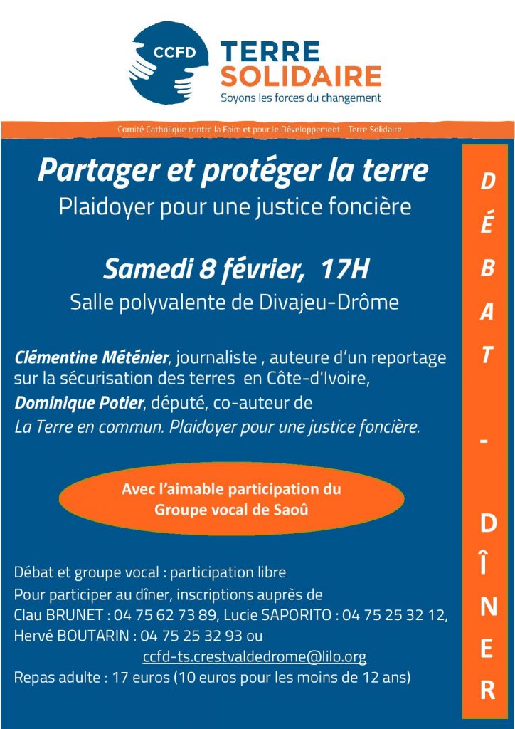 Samedi 8 février 2020, le CCFD – Terre solidaire organise un dîner débat pour partager et protéger la terre, animé par Clémentine Méténier, journaliste , auteure d’un reportage sur la sécurisation des terres en Côte-d’Ivoire, et Dominique Potier, député, co-auteur de La Terre en commun.