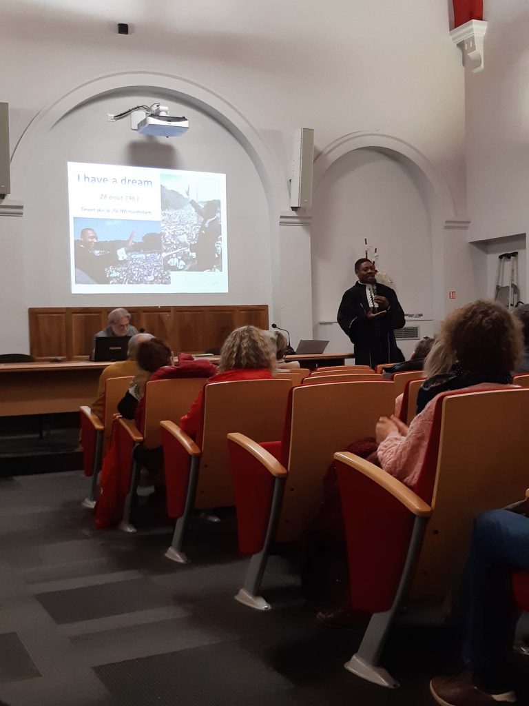 L’intervention d’un pasteur Noir, qui avait fait le déplacement depuis Grenoble, pour réciter une partie du célèbre discours : « I have a dream », a fortement impressionné le public conquis par cette petite mise en scène inattendue, vibrante et remarquable, au milieu de la conférence, si l’on en juge par les applaudissements enthousiastes.
